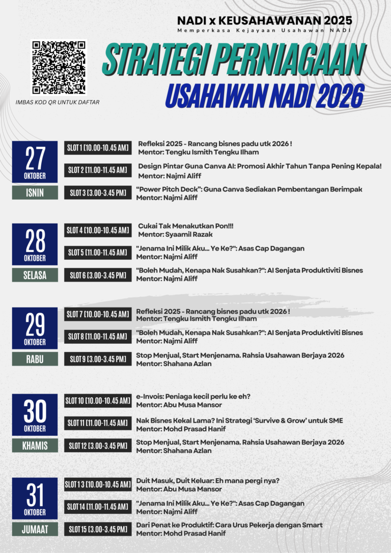 Salam NADI x Keusahawanan, Tahun 2026 bakal sengit namun sarat peluang. Usahawan NADI, sudahkah anda siapkan pelan perniagaan untuk jualan melonjak?Jom sertai webinar βStrategi Perniagaan Usahawan NADI 2026β pada: π 27 β 31 Oktober 2025π 10.00 pagi β 3.45 petang […]