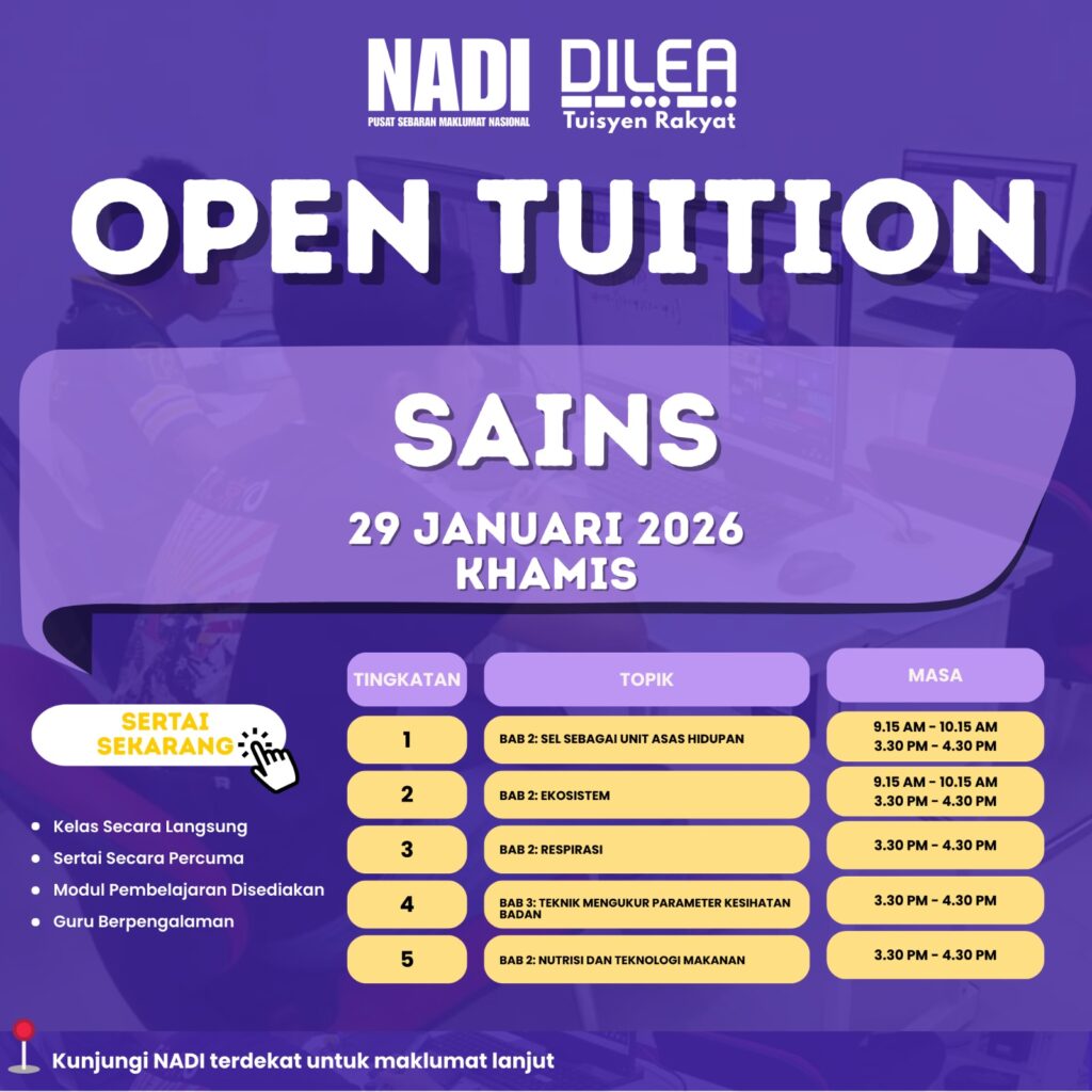 Jom sertai Open Tuition bersama NADI DILEA Tuisyen Rakyat! Kelas ini adalah PERCUMA dan dikendalikan secara langsung!