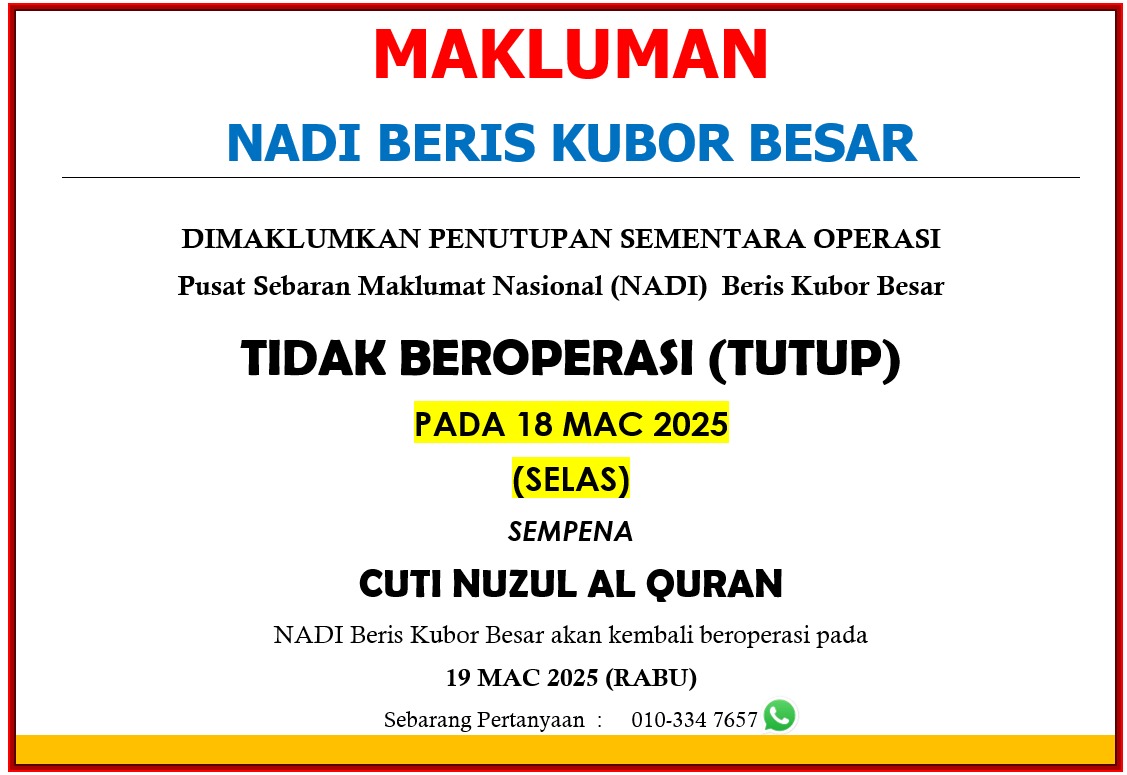 Penutupan Sementara Operasi Pusat Sebaran Maklumat Nasional (NADI) Beris Kubor Besar Tidak Beroperasi (TUTUP) pada : 18 Mac 2025 (Selasa) sempena Cuti Nuzul Al Quran. NADI akan kembali beroperasi pada 19 Mac 2025 (Rabu). Sekian makluman. Terima Kasih.