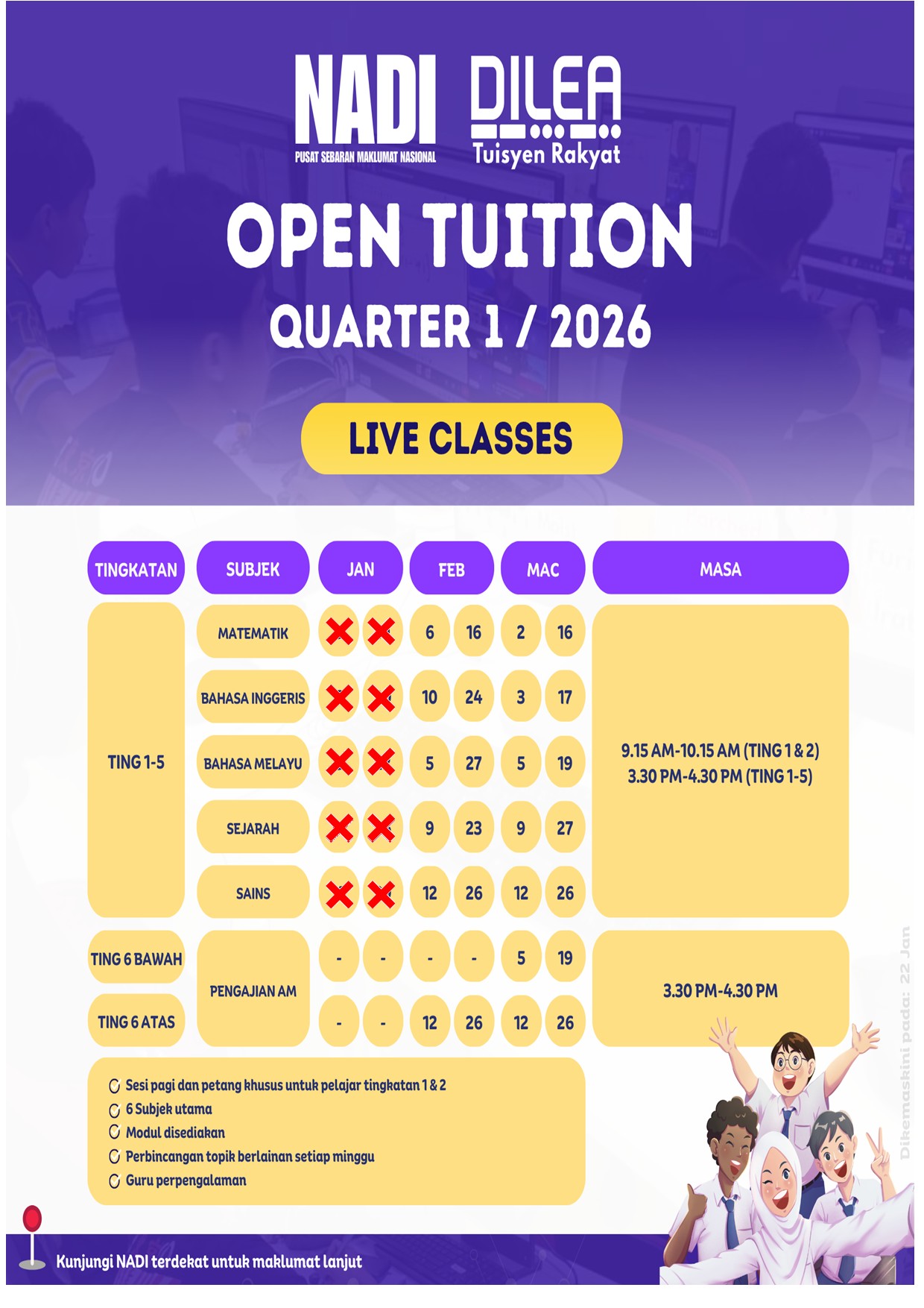 OPEN TUITION SAINS KHAMIS INI! Untuk semua pelajar Tingkatan 1 hingga 5! Nak faham konsep Sains dengan lebih mudah? Rasa susah nak ingat fakta penting? Jom sertai Open Tuition bersama NADI DILEA Tuisyen Rakyat! Kelas ini adalah PERCUMA dan dikendalikan […]