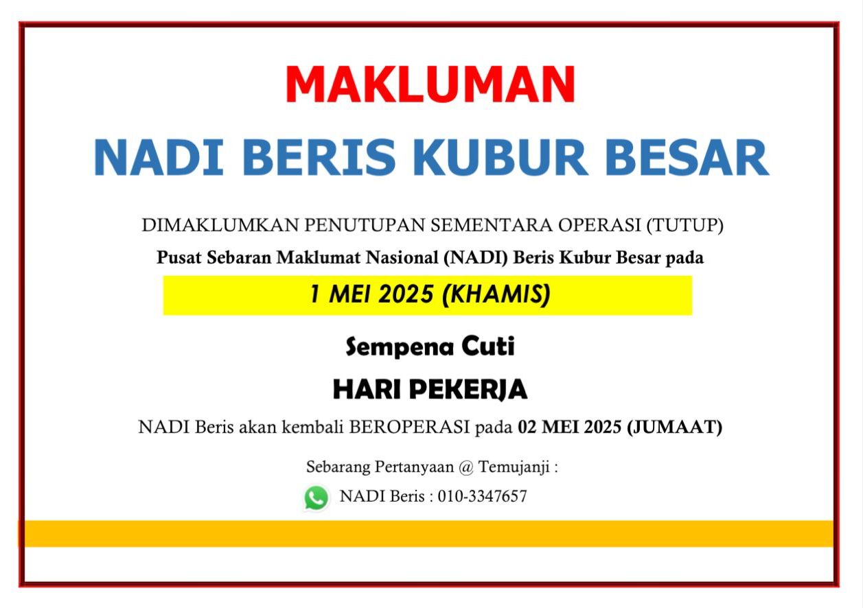 Penutupan Sementara Operasi Pusat Sebaran Maklumat Nasional (NADI) Beris Kubor Besar Tidak Beroperasi (TUTUP) pada : 18 Mac 2025 (Selasa) sempena Cuti Nuzul Al Quran. NADI akan kembali beroperasi pada 19 Mac 2025 (Rabu). Sekian makluman. Terima Kasih.