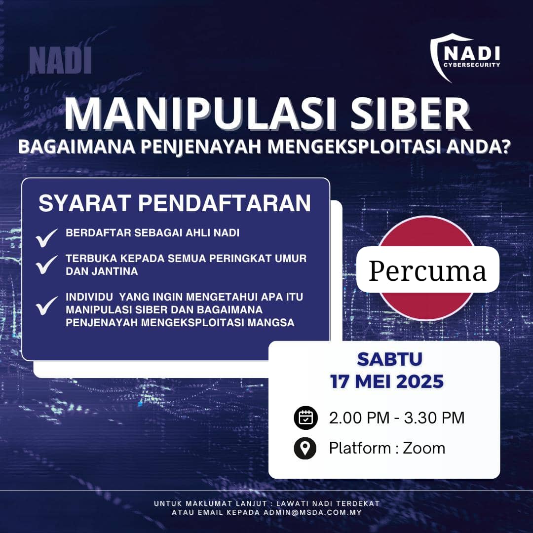 WEBINAR : MANIPULASI SIBER : BAGAIMANA PENJENAYAH MENGEKSPLOITASI ANDA? Webinar ini menekankan aspek serangan psikologi yang digunakan dalam kejuruteraan sosial serta langkah-langkah pencegahan yang boleh diambil oleh individu dan organisasi. Hari: Sabtu Tarikh: 17 May 2025 Masa: 02.00 petang – […]