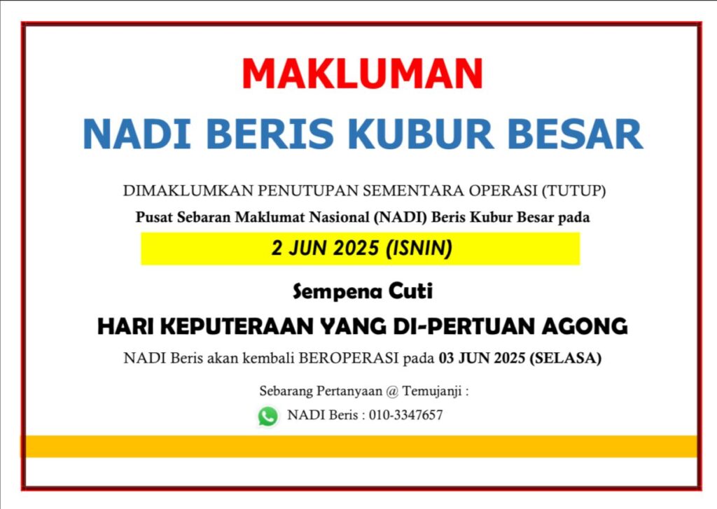 Penutupan Sementara NADI Beris Kubor Besar Sempena CUTI HARI KEPUTERAAN YANG DI-PERTUAN AGONG